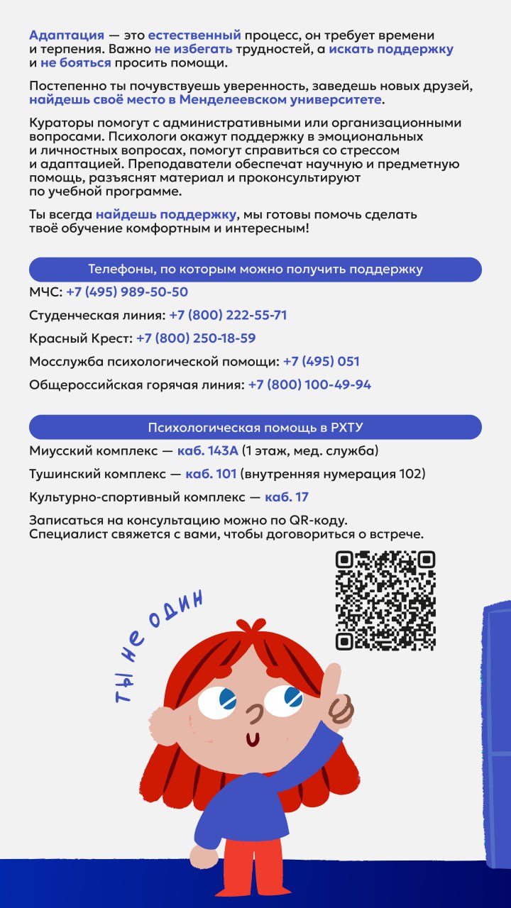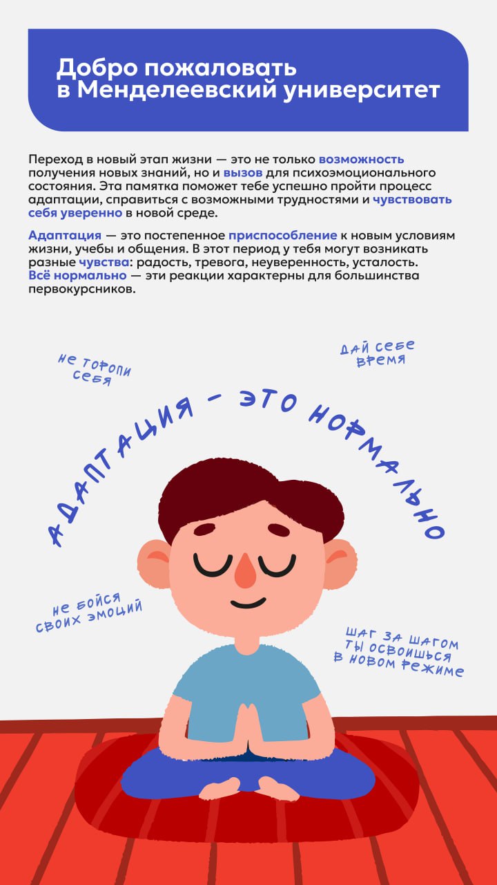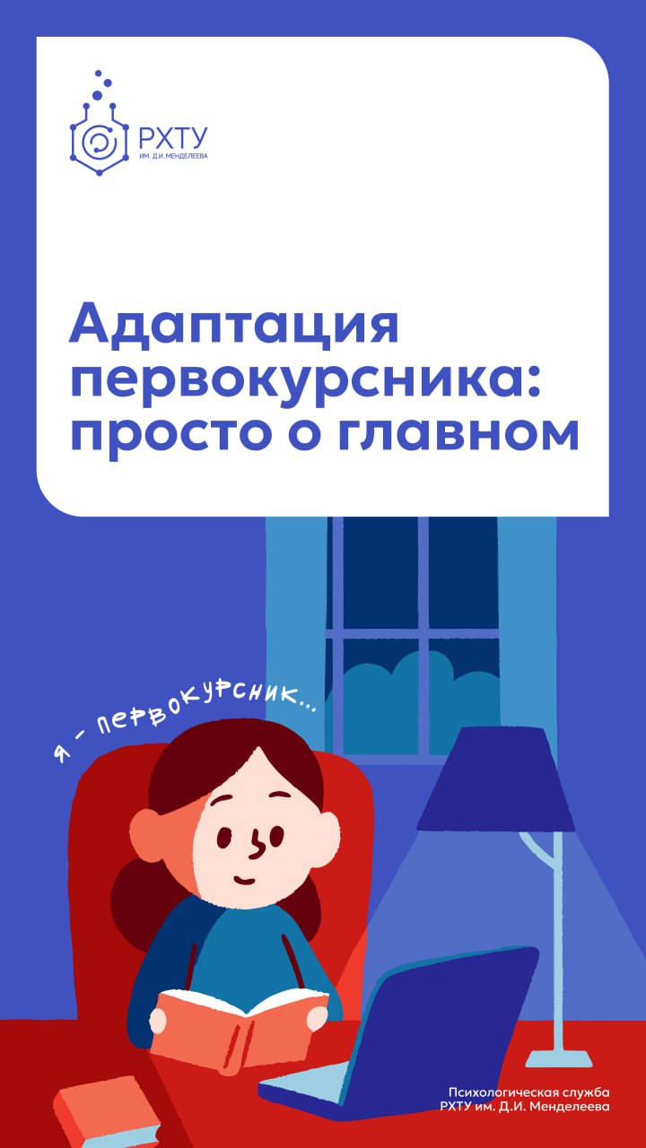 Чтобы поддержать вас в этот период, психологическая служба РХТУ им. Д.И. Менделеева (https://t.me/muctr_official) подготовила памятку «Адаптация первокурсника: просто о главном».