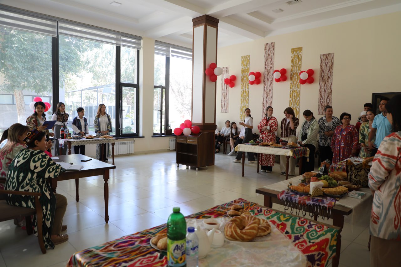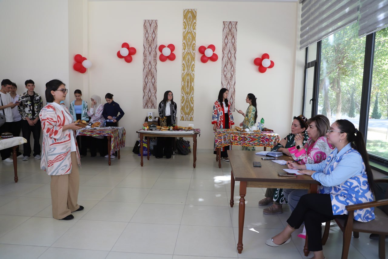 🔸 Студентки оформили традиционный узбекский дастурхон, органично сочетая элементы национальной культуры и яркие узоры хан-атласа. Красочные блюда, традиционные атрибуты и художественный вкус каждой команды превратили конкурс в настоящий праздник национальных традиций.