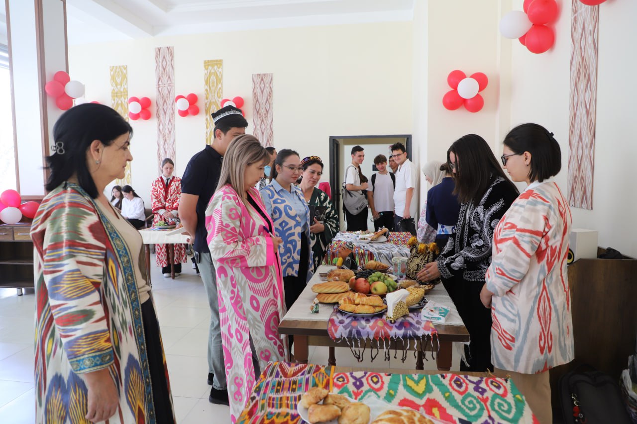 🔸 Студентки оформили традиционный узбекский дастурхон, органично сочетая элементы национальной культуры и яркие узоры хан-атласа. Красочные блюда, традиционные атрибуты и художественный вкус каждой команды превратили конкурс в настоящий праздник национальных традиций.