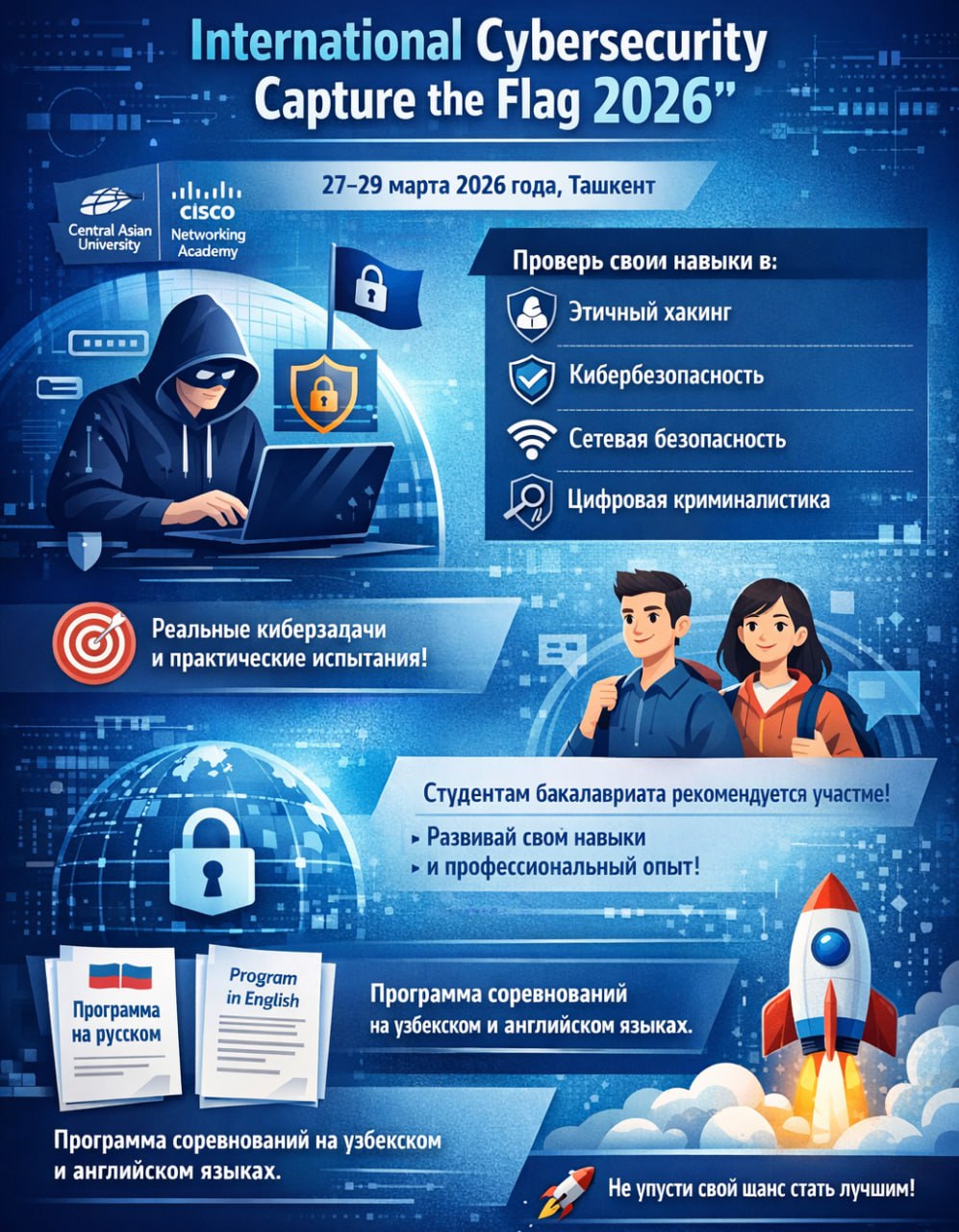 «Central Asian University», в период с 27 по 29 марта 2026 года совместно с «Cisco Networking Academy» организовывает международное студенческое соревнование “International Cybersecurity Capture the Flag 2026”.